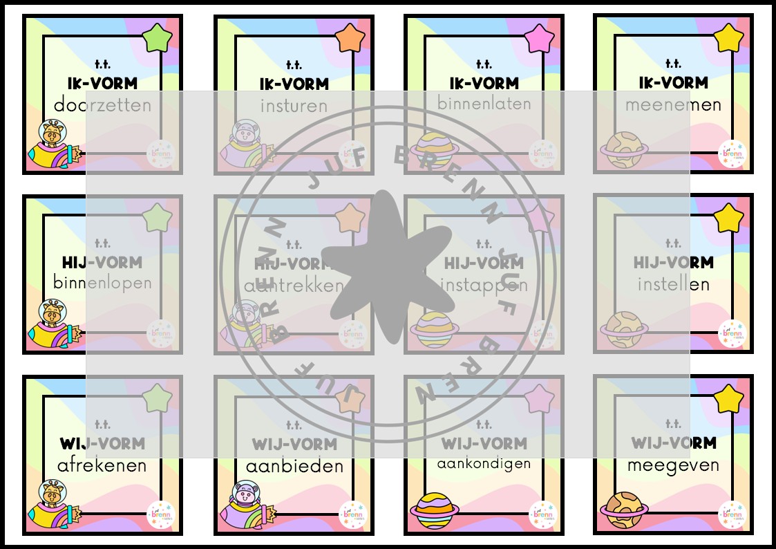 Deze download bevat Kaboom! Dit spel kun je inzetten bij het oefenen met het vervoegen van scheidbare werkwoorden in de tegenwoordige tijd, verleden tijd en het voltooid deelwoord. Het zijn 72 kaartjes. Het is geschikt voor groep 6/7/8.