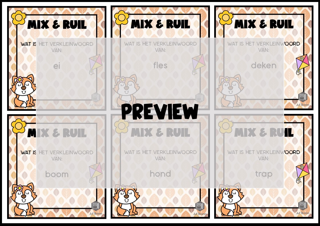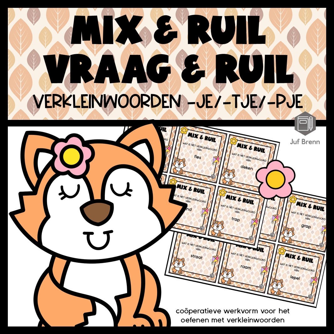 Deze download bevat Mix & Ruil en Vraag & Ruil. Met deze werkvorm kun je jouw leerlingen laten oefenen met verkleinwoorden die eindigen op -je / -tje / -pje. Het zijn 36 kaartjes. Voor vraag en ruil kun je de dubbelzijdige versie printen, voor mix en ruil de enkelzijdige versie. Het is geschikt voor groep 4/5/6.