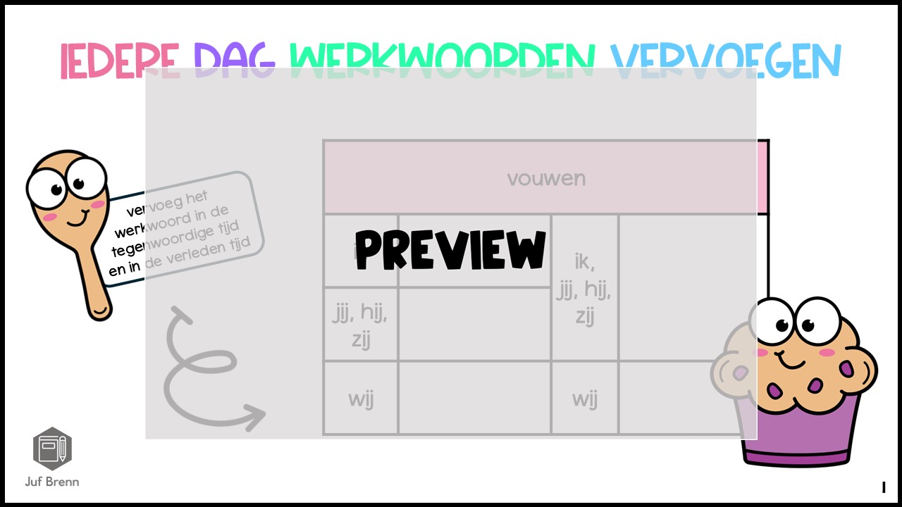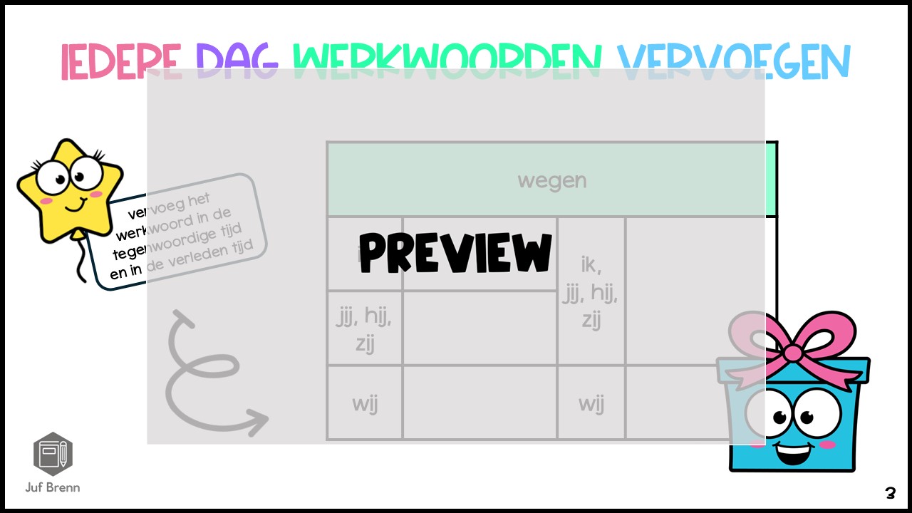 Deze download bevat een slides. Met deze slides kun leerlingen iedere dag laten oefenen met het vervoegen van werkwoorden in de verleden tijd. Er zitten 50 slides in deze set (en nog eens 50 slides met antwoorden). Je kunt de afbeelding toevoegen aan bijvoorbeeld Gynzy / Prowise / PowerPoint. Er zit ook een PDF bij die je kunt openen op het bord. Perfect om in te zetten als dagstart, of tijdens je les. Het is geschikt voor groep 5/6/7/8.