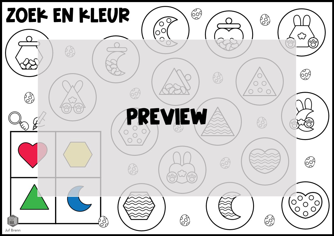 Deze download bevat Spin & Kleur. Hiermee kun je jouw leerlingen laten oefenen met het herkennen en benoemen van vormen: driehoek, vierkant, vijfhoek, zeshoek, achthoek, rechthoek, cirkel, ruit, hart, ster, maan en ovaal. Er zitten 5 doebladen in. Het is geschikt voor groep 1/2/3.