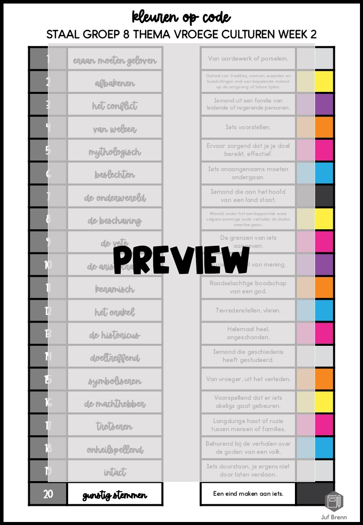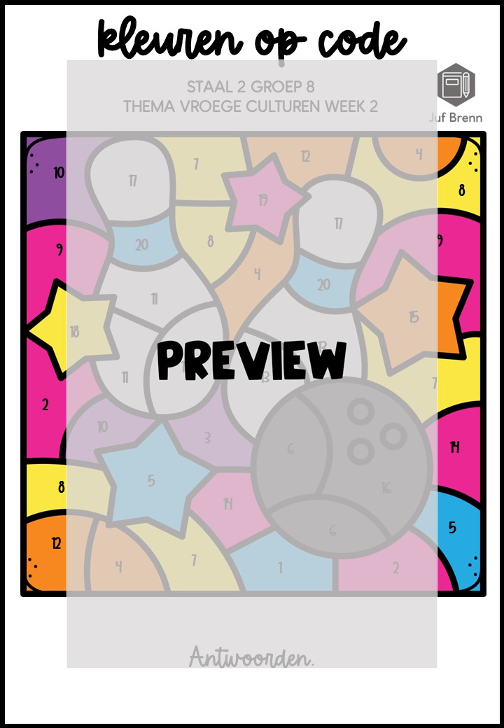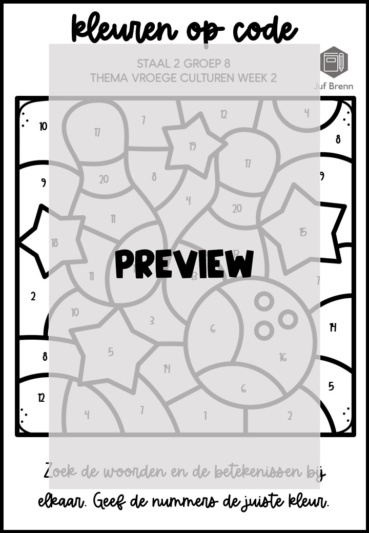 Deze download bevat Kleuren Op Code. Deze werkbladen sluiten aan bij Staal (versie 2) groep 8 thema vroege culturen en kun je inzetten voor het consolideren. Het zijn in totaal 4 verschillende werkbladen. Iedere week heeft een eigen werkblad, en er zitten twee werkbladen bij waar week 1/2 gemixt zijn.