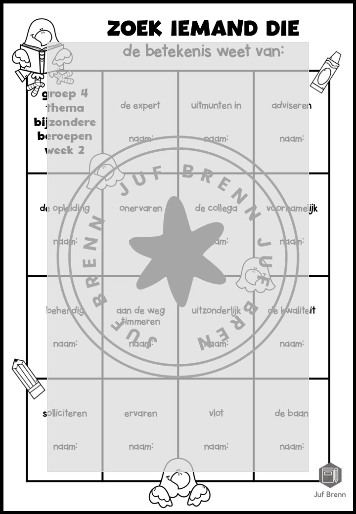 Deze download bevat Zoek iemand die. Het sluit aan bij Staal 2. Deze versie van Zoek iemand die kan ingezet worden voor het consolideren van de themawoorden. Het zijn 4 werkbladen: 1 voor elke les en 2 mix. Het is geschikt voor groep 4.