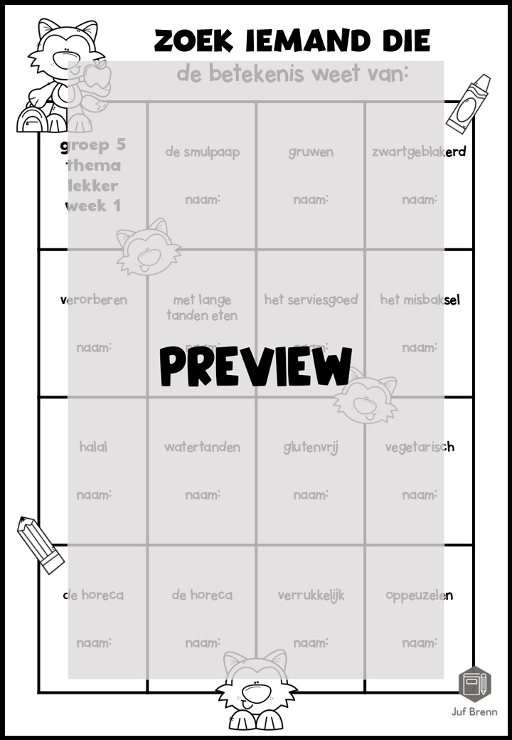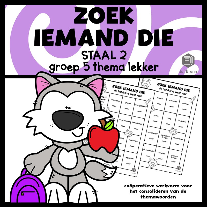 Deze download bevat Zoek iemand die. Het sluit aan bij Staal 2. Deze versie van Zoek iemand die kan ingezet worden voor het consolideren van de themawoorden. Het zijn 4 werkbladen: 1 voor elke les en 2 mix. Het is geschikt voor groep 5.