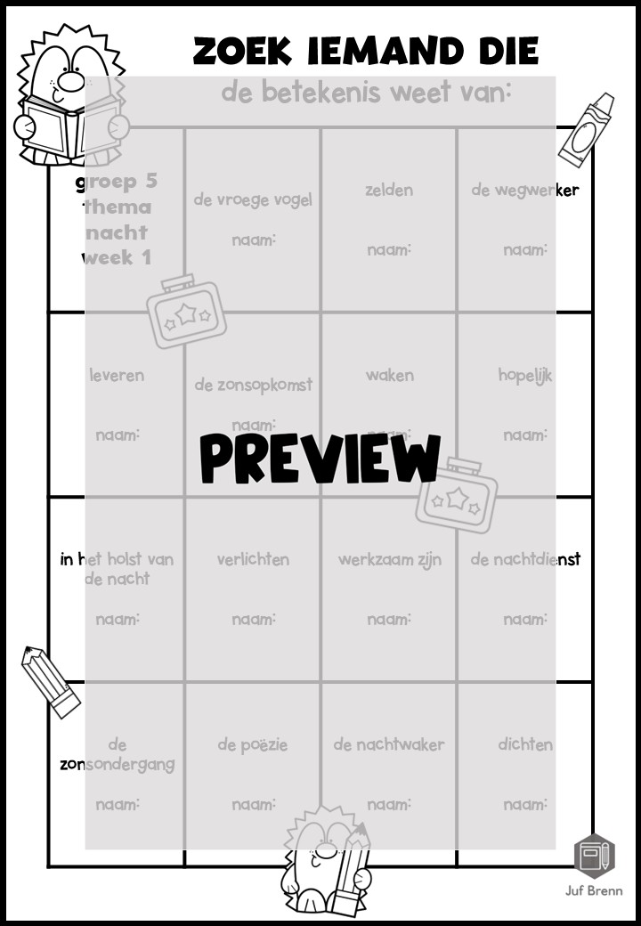 Deze download bevat Zoek iemand die. Het sluit aan bij Staal 2. Deze versie van Zoek iemand die kan ingezet worden voor het consolideren van de themawoorden. Het zijn 4 werkbladen: 1 voor elke les en 2 mix. Het is geschikt voor groep 5.