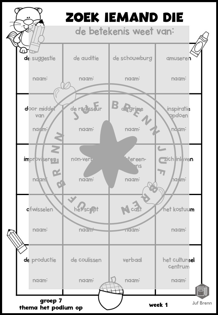 Deze download bevat Zoek iemand die. Het sluit aan bij Staal 2. Deze versie van Zoek iemand die kan ingezet worden voor het consolideren van de themawoorden. Het zijn 4 werkbladen: 1 voor elke les en 2 mix. Het is geschikt voor groep 7.
