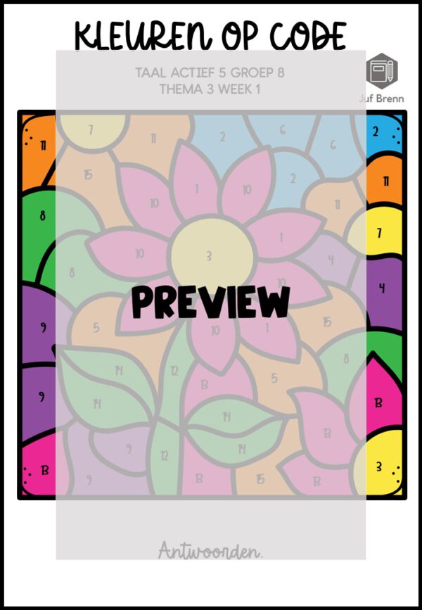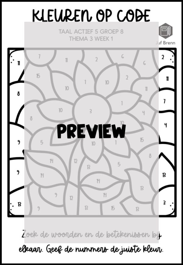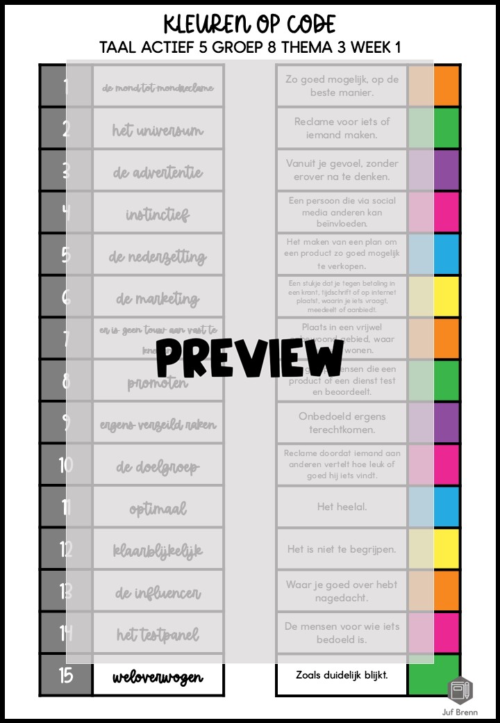 Deze download bevat Kleuren Op Code. Deze werkbladen sluiten aan bij Taal Actief (versie 5) groep 8 thema 3 en kun je inzetten voor het consolideren. Het zijn in totaal 5 verschillende werkbladen. Iedere week heeft een eigen werkblad, en er zitten twee werkbladen bij waar week 1/2/3 gemixt zijn.