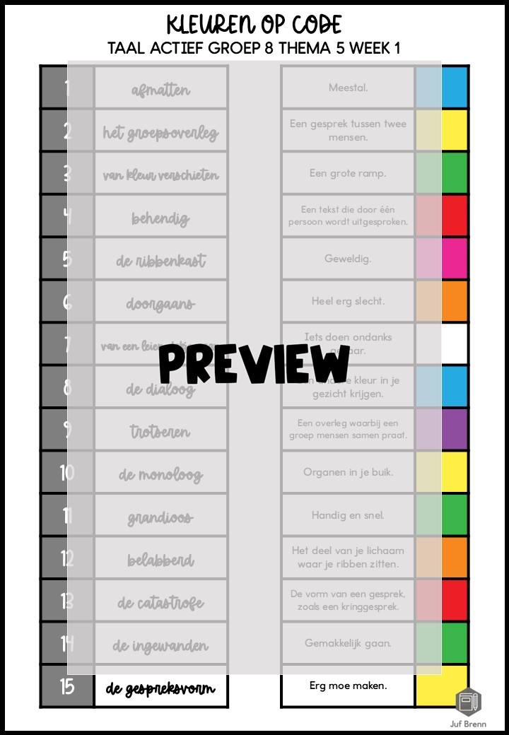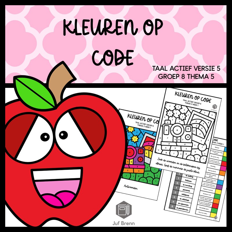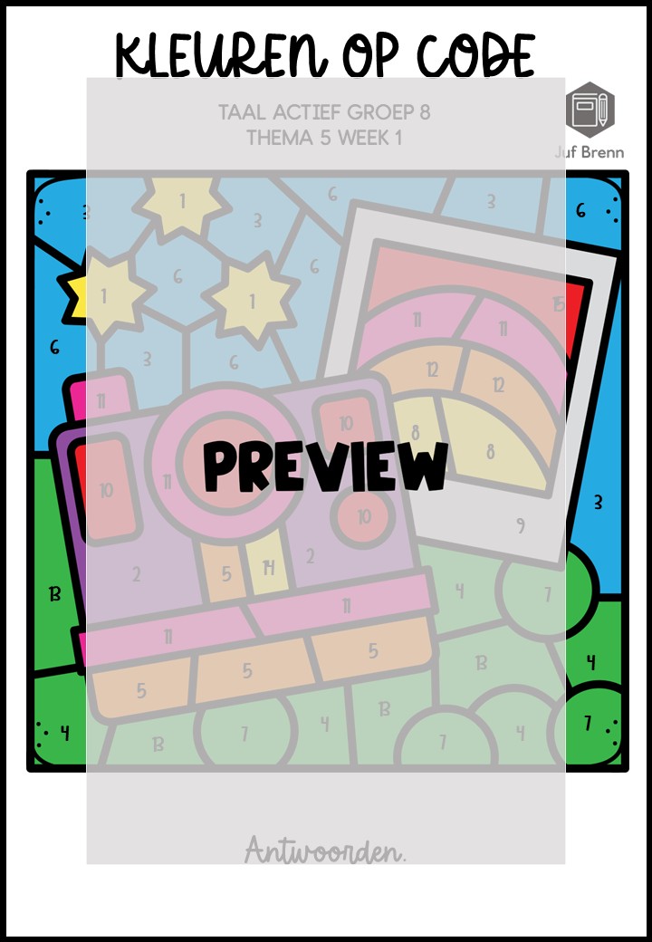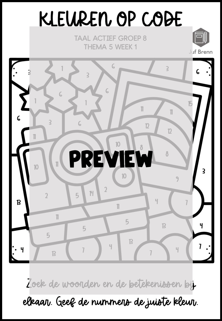 Deze download bevat Kleuren Op Code. Deze werkbladen sluiten aan bij Taal Actief (versie 5) groep 8 thema 5 en kun je inzetten voor het consolideren. Het zijn in totaal 5 verschillende werkbladen. Iedere week heeft een eigen werkblad, en er zitten twee werkbladen bij waar week 1/2/3 gemixt zijn.