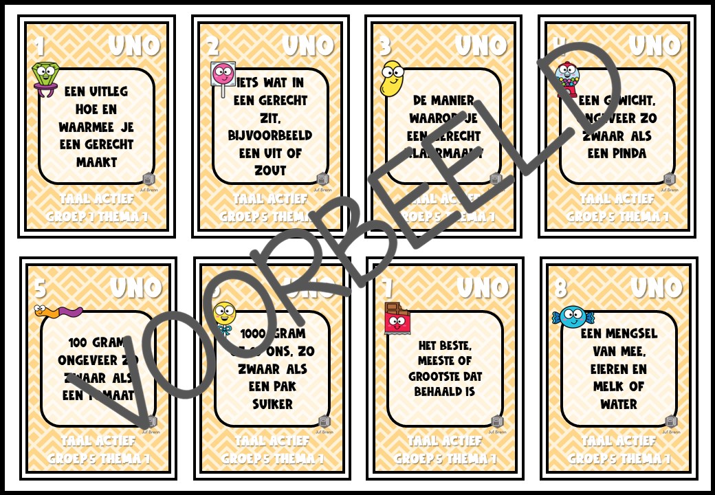 Deze download bevat UNO. Dit spel sluit aan bij Taal Actief (versie 5) groep 5 thema 7 en kun je inzetten voor het consolideren. Het zijn 114 kaartjes. Alle woorden + betekenissen zitten erin. Wil je weten hoe dit spel werkt? Klik dan hier.