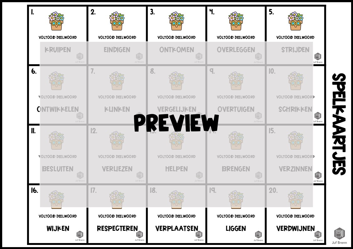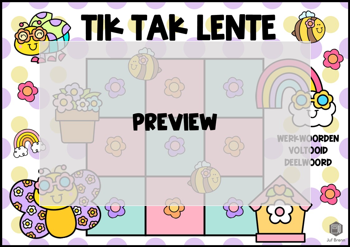 Deze download bevat Tik Tak Lente! Dit spel kan gebruikt worden voor het oefenen met het vervoegen van het voltooid deelwoord. Dit product bevat een spelbord, kaartjes voor de spelers (fiches), 40 kaartjes voor het spelbord en een antwoordenblad. Wil je weten hoe het spel werkt? Ik schreef er een speluitleg over. Het is geschikt voor groep 5/6/7/8.