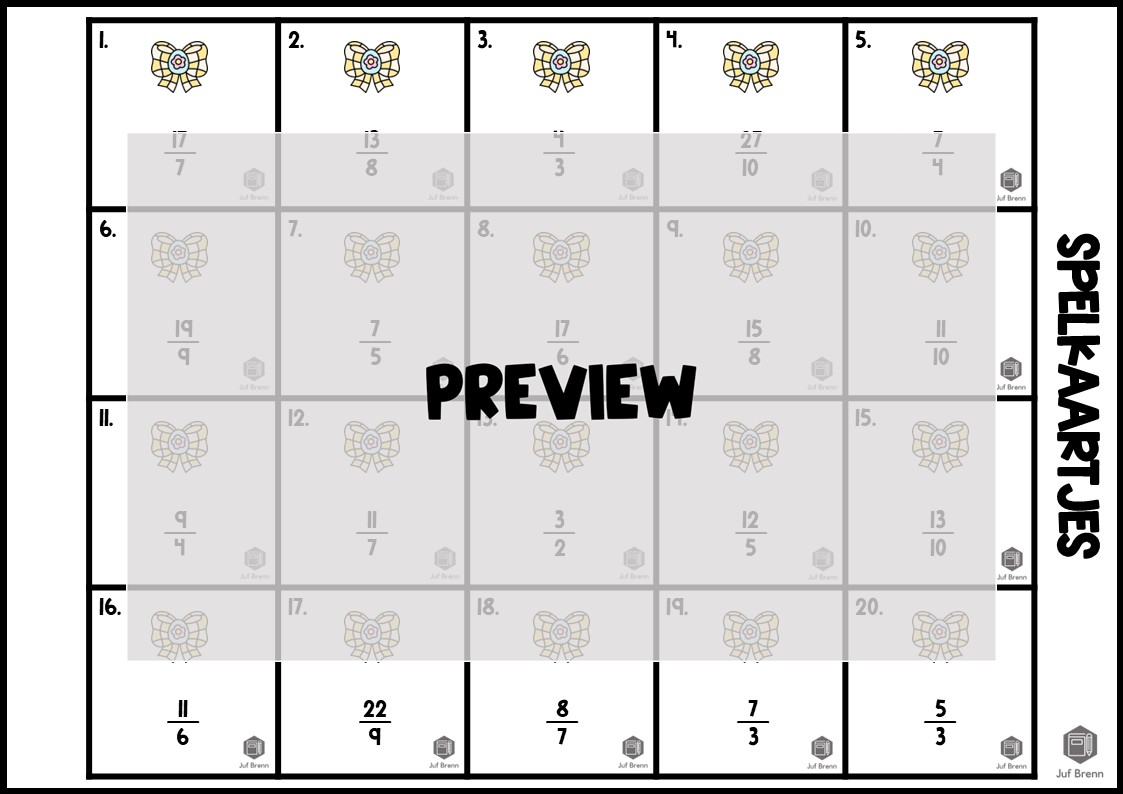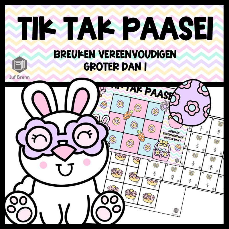 Deze download bevat Tik Tak Paasei! Dit spel kan gebruikt worden voor het oefenen met het vereenvoudigen van breuken. De breuken zijn groter dan 1 en kleiner dan 3. Dit product bevat een spelbord, kaartjes voor de spelers (fiches), 40 kaartjes voor het spelbord en een antwoordenblad. Wil je weten hoe dit spel werkt? Ik schreef een blog over de Valentijn variant. Het is geschikt voor groep 6/7/8.