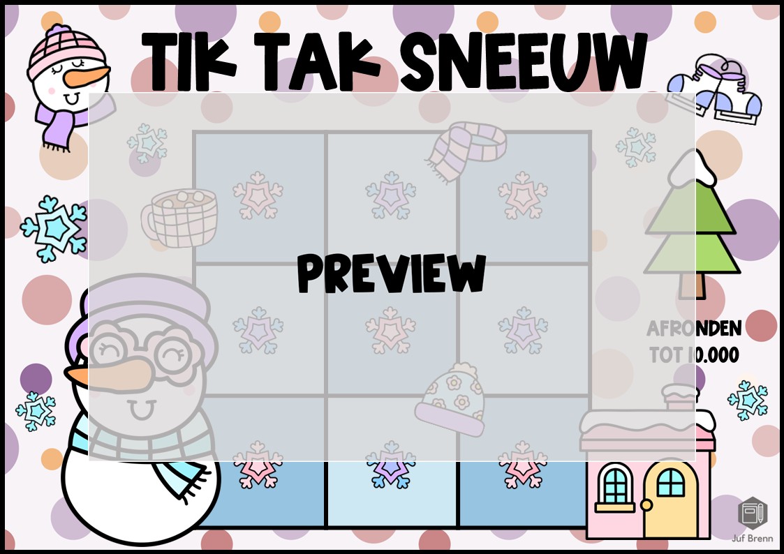 Deze download bevat Tik Tak Sneeuw! Dit spel kan gebruikt worden voor het oefenen met het afronden tot 10.000. Er moet afgerond worden op tientallen, honderdtallen en duizendtallen. Dit product bevat een spelbord, kaartjes voor de spelers (fiches), 40 kaartjes voor het spelbord en een antwoordenblad. Wil je weten hoe het spel werkt? Ik schreef voor de kerst editie een speluitleg. Het is geschikt voor groep Het is geschikt voor groep 6/7/8.