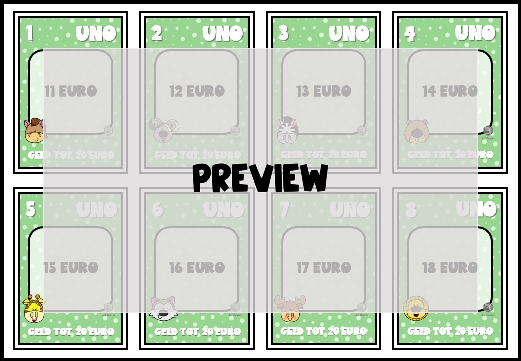 Deze download bevat Uno! Dit spel kan gebruikt worden voor het oefenen met geld tot 20 euro. Het zijn bedragen in hele euro’s waarbij gebruik gemaakt is van een biljet van 10 euro, 5 euro en munten van 1 en 2 euro. Dit product bevat 56 kaartjes (+ 14 extra). Het is geschikt voor groep 3/4.