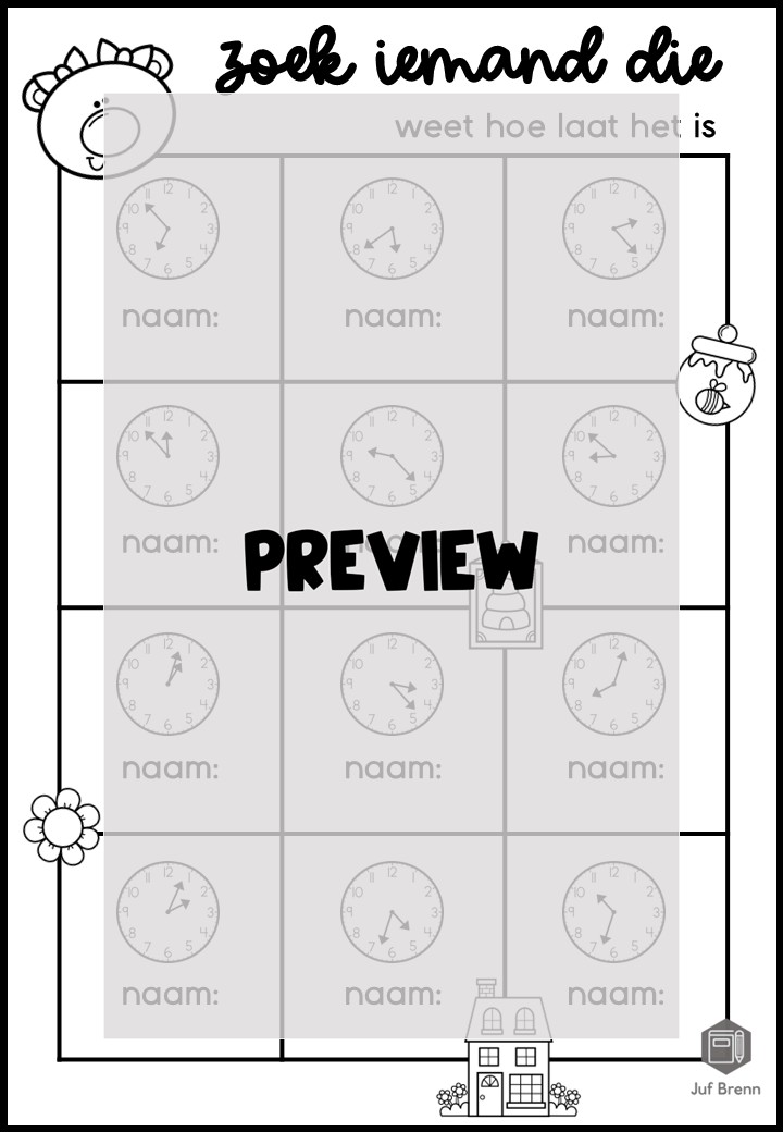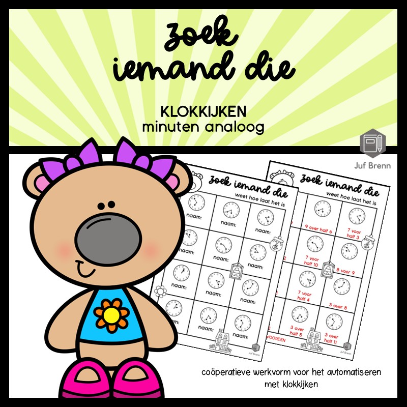 Deze download bevat Zoek iemand die. Met deze werkvorm kun je jouw leerlingen laten oefenen met het klokkijken van minuten. Het is geschikt voor groep 4/5/6. Klik op de downloadbutton hieronder om het bestand te downloaden.