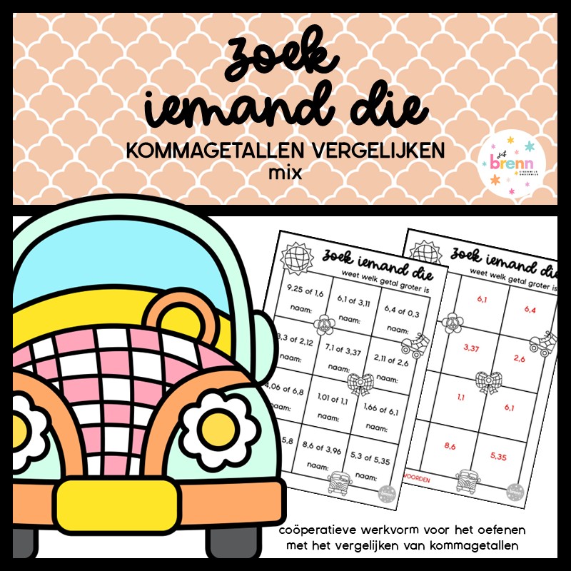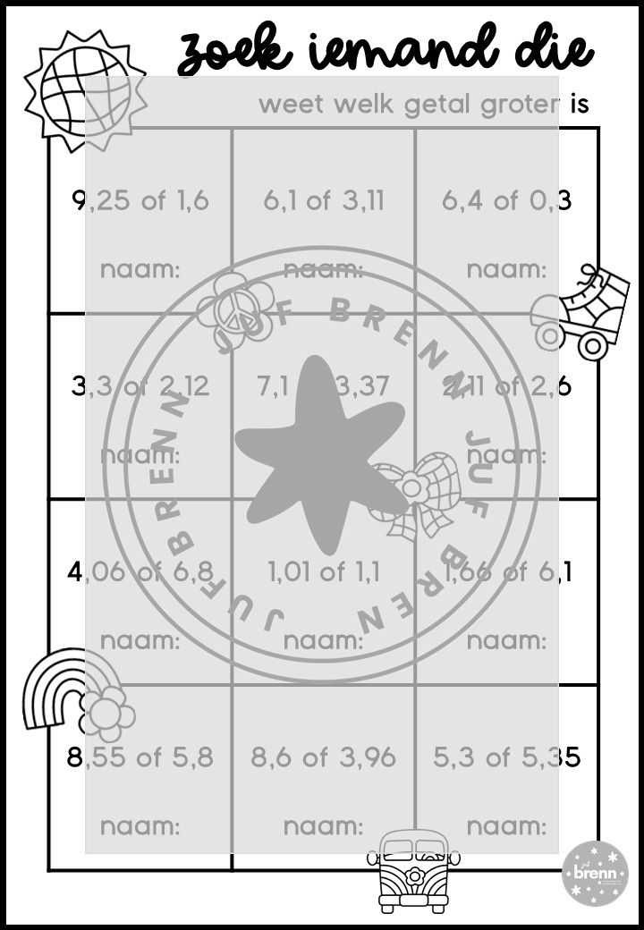 Deze download bevat Zoek iemand die. Met deze werkvorm kun je jouw leerlingen laten oefenen met het vergelijken van kommagetallen met 1 en / of 2 decimalen achter de komma. Welk getal is groter? Het is geschikt voor groep 6/7/8. Klik op de downloadbutton hieronder om het bestand te downloaden. (let op! je hoeft het niet aan je winkelmandje toe te voegen)