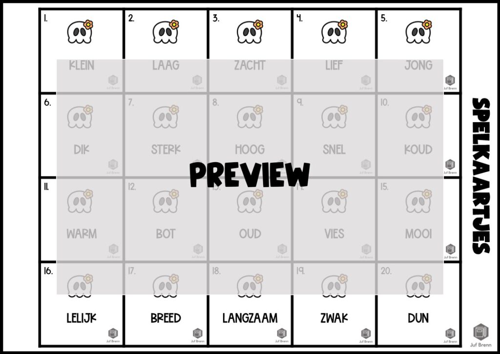 Print het spelbord, de kaartjes voor speler 1 en 2 en de 40 kaartjes met daarop de woorden. Je kunt er bij kaartjes met de woorden voor kiezen om ze dubbelzijdig te printen zodat er een kleurde achterkant toegevoegd wordt aan het kaartje.