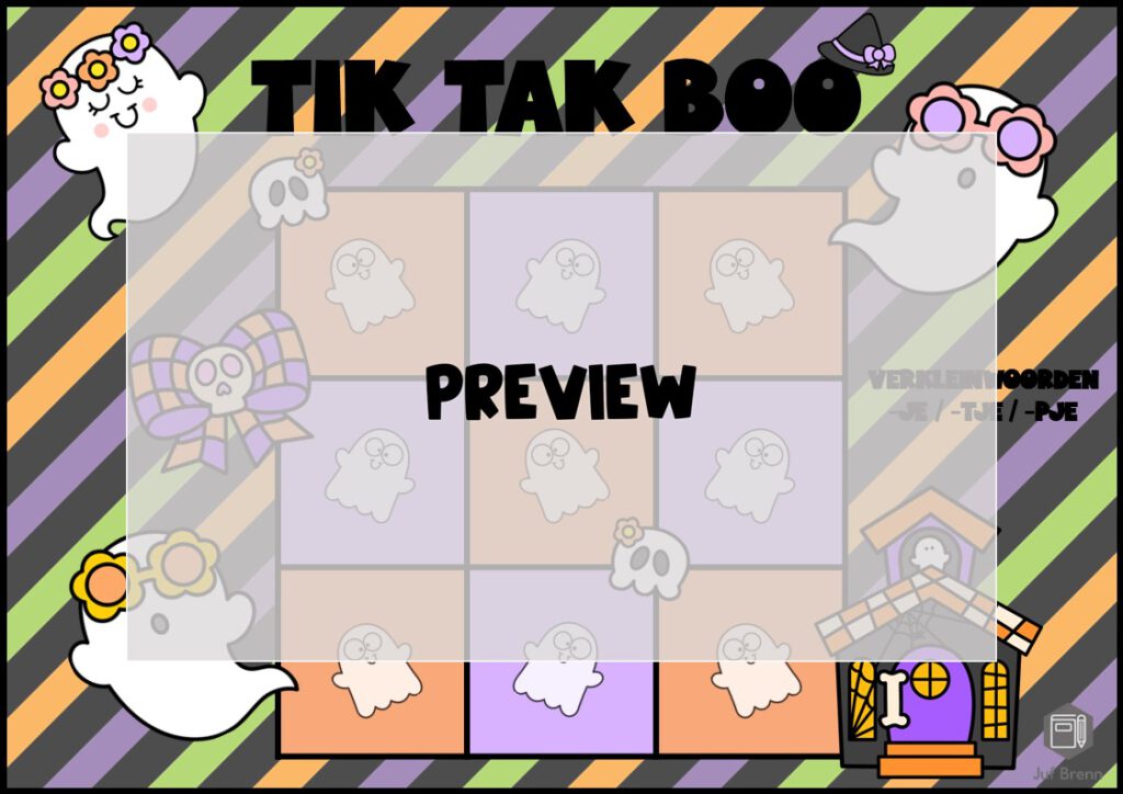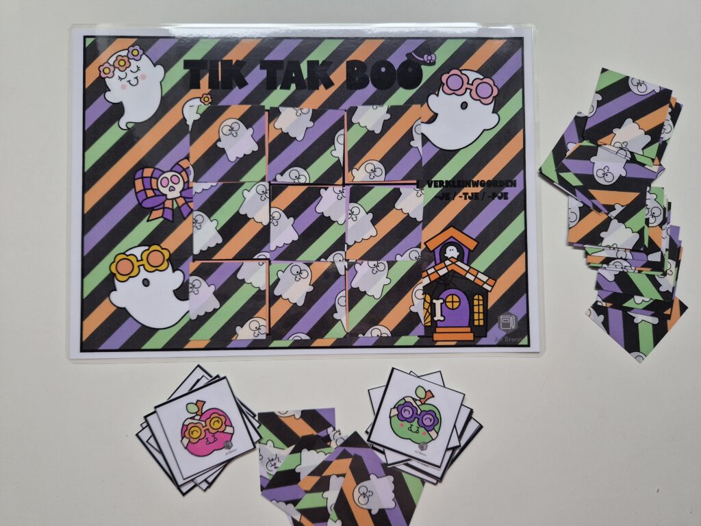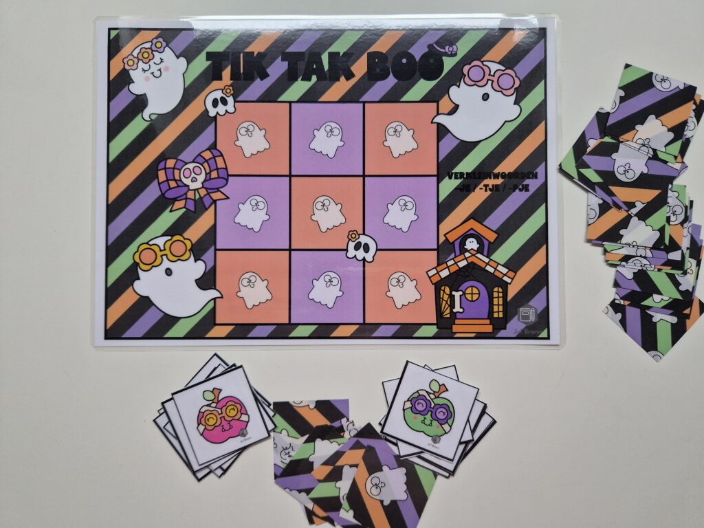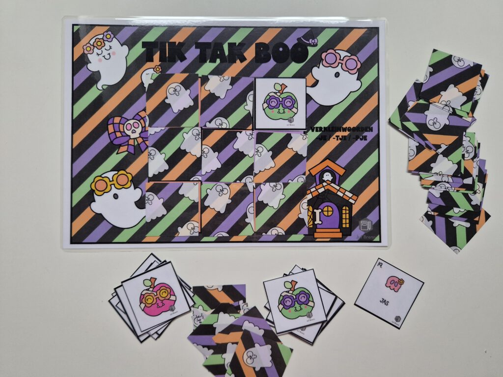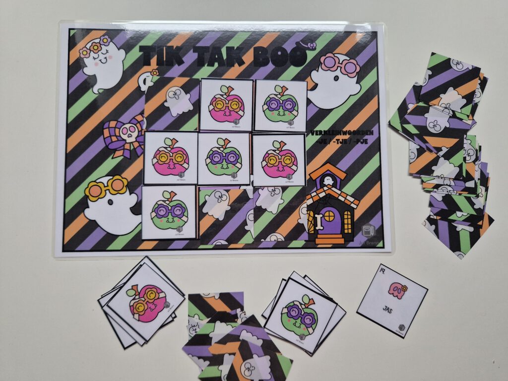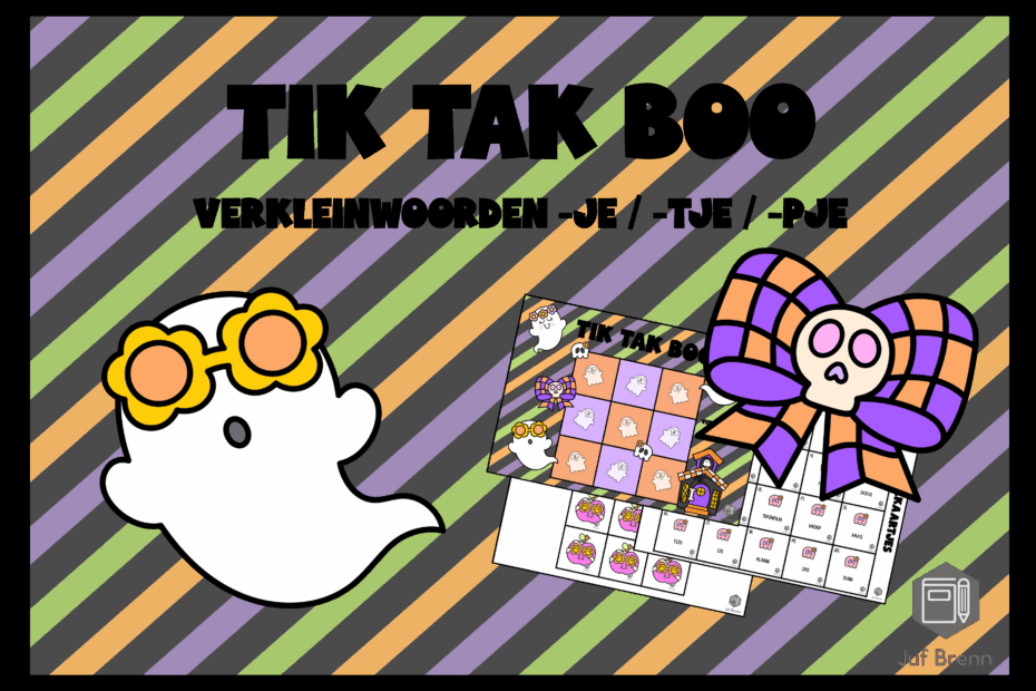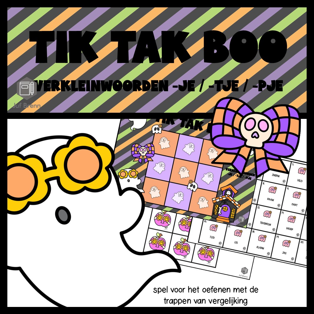 NIEUW! Tik Tak Boo is een spel dat past in het thema Halloween. Maar uiteraard ben je niet thema gebonden met dit spel. Met dit spel kun je jouw leerlingen laten oefenen / automatiseren met met verkleinwoorden. De volgende vervoegingen zitten in het spel: -je/-tje/-pje. Hieronder lees je alles over dit spel.