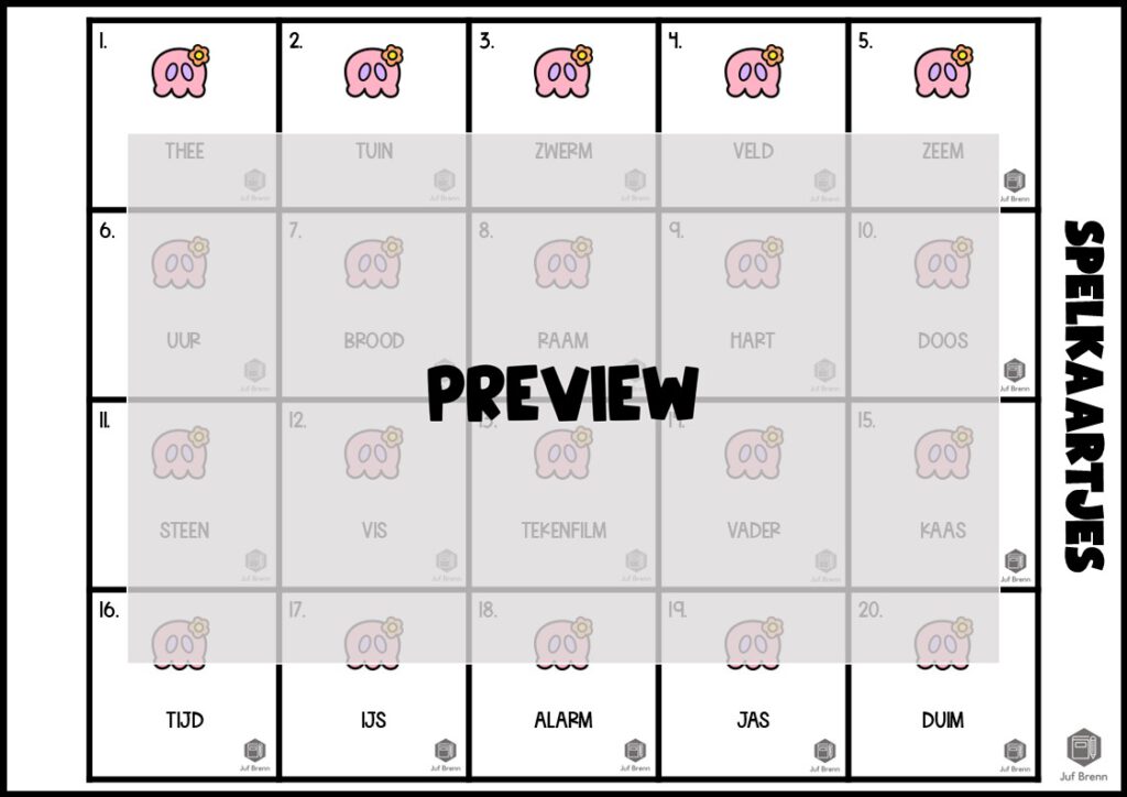 Print het spelbord, de kaartjes voor speler 1 en 2 en de 40 kaartjes met daarop de woorden. Je kunt er bij kaartjes met de woorden voor kiezen om ze dubbelzijdig te printen zodat er een kleurde achterkant toegevoegd wordt aan het kaartje.